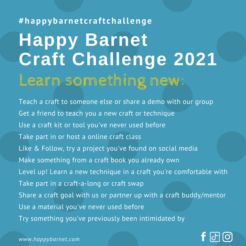 It doesn’t matter what craft(s) you enjoy or how experienced you are, everyone is welcome to join in and our Facebook group is one of the best places to do that. You can also follow our posts on the Happy Barnet Instagram TikTok accounts. And don’t forget to use the #happybarnetcraftchallenge hashtag so we can see your projects and share them with our other craft challengers….and feature them in our challenge galleries!!!